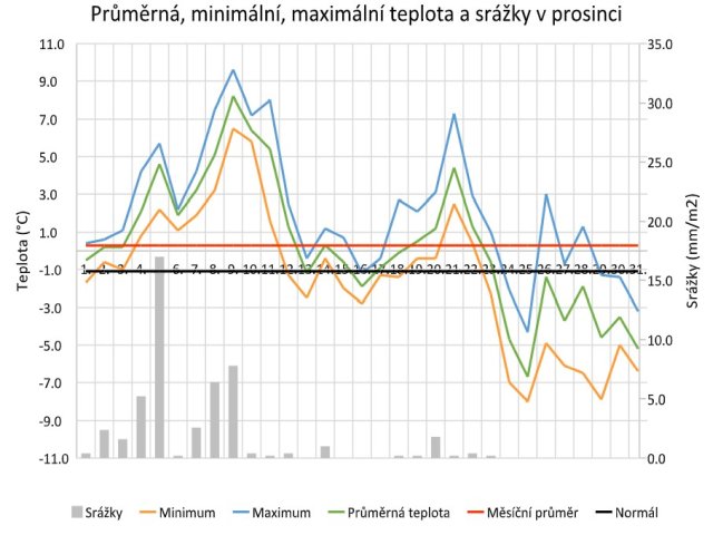 Právě uplynulý rok měření na školní meteostanici uzavíráme shrnutím základních pozorovaných charakteristik za měsíc prosinec. První polovina měsíce byla teplotně nadprůměrná, ve druhé polovině měsíce byly již teploty typicky zimní.