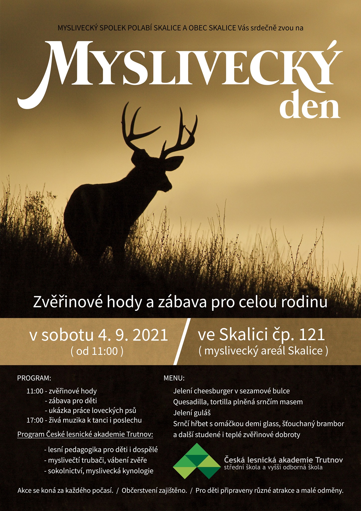 Srdečně vás zveme na Myslivecký den, který se bude konat v sobotu 4.9.2021 ve Skalici u Smiřic. Těšit se můžete na zvěřinové hody a zábavu pro celou rodinu. Na akci se představí naši studenti, kteří zajišťují lesní pedagogiku. Přijďte si užít krásný Myslivecký den. Těšíme se na vás!