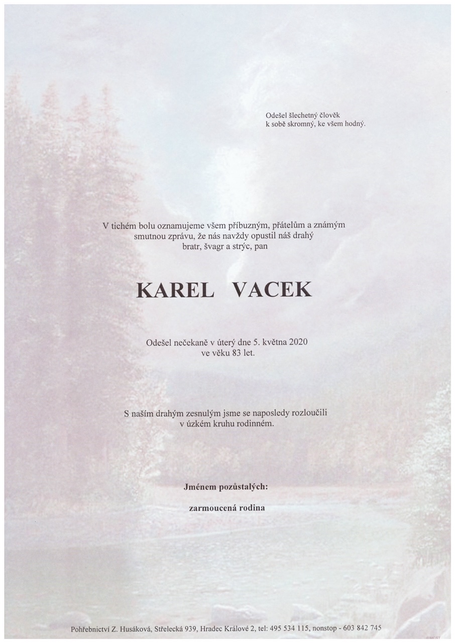 Všem přátelům, především však absolventům naší školy oznamujeme velmi smutnou zprávu, že 5.května 2020 zemřel ve věku 83 let náš bývalý kolega Karel Vacek. Na naší lesárně působil letech 1963 až 1999 ve funkci vedoucího vychovatele, později vychovatele a byl průkopníkem chovu koní na naší škole. Čest jeho památce.