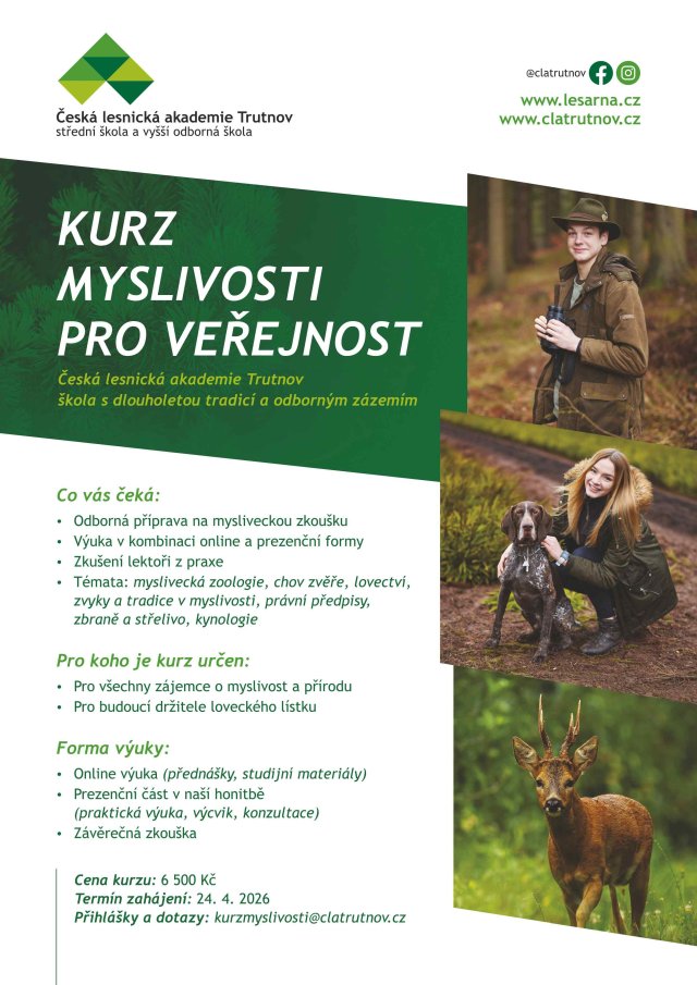 ČLA Trutnov nabízí všem zájemcům o myslivost a přírodu Kurz myslivosti. Celým kurzem Vás provede tým lektorů a zkušebních komisařů, který je složen ze zkušených pedagogů lesnické školy, což zaručuje jeho vysokou odbornou úroveň.