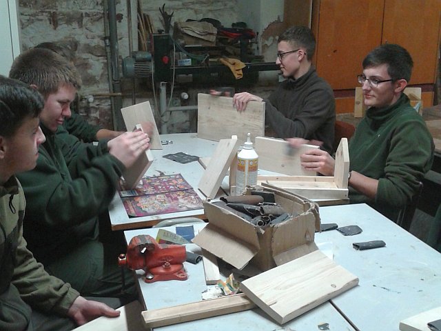 V měsíci říjnu pracovní kroužek opět uklízel, tentokrát především listí kolem Domova mládeže a školního altánu. Přestěhovali jsme také psí kotec od jídelny na nově vybudované stanoviště. V naší dílně jsme vyráběli ptačí krmítka a orientační tabulky pro Domov mládeže, stejně jako výrobky ze dřeva pro dny otevřených dveří.