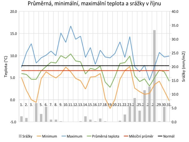 Průměrná říjnová teplota na školní meteostanici dosáhla hodnoty 6,6 °C, tj. o 1,1 °C méně, než je dlouhodobý normál. Přesto můžeme uplynulý měsíc hodnotit jako teplotně průměrný. Teplotní extrémy 16,7 °C (maximum) a -2,0 °C (minimum) nastaly 11., resp. 19. října. Stanice současně zaznamenala 3 mrazové dny). Srážkově byl říjen poměrně bohatý, celkový úhrn srážek činil 109 mm.
