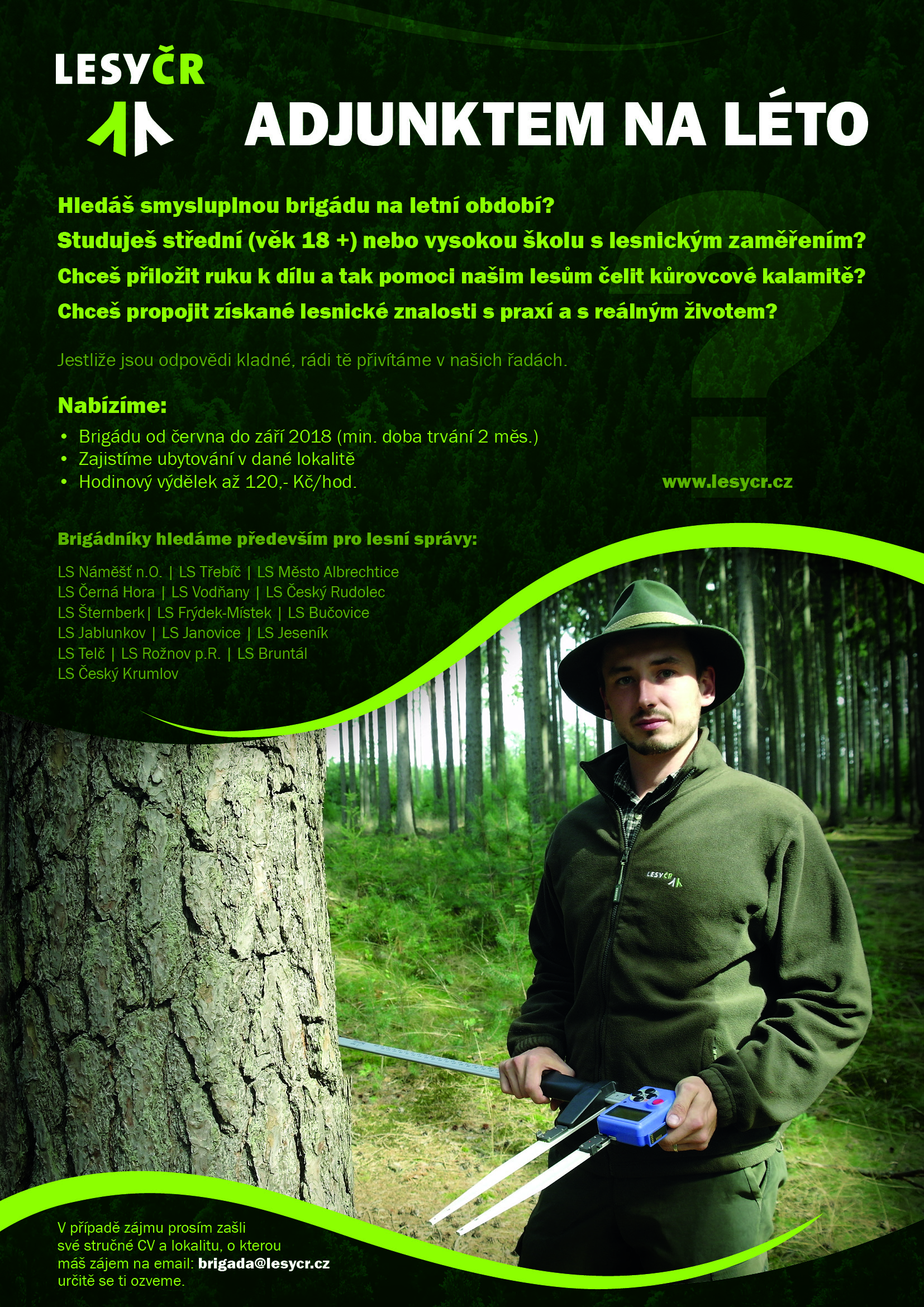 Hledáš smysluplnou brigádu na letní období? Brigádu od června do září 2018 nabízí společnosti Lesy ČR s.p. Více informací v přiloženém letáku.