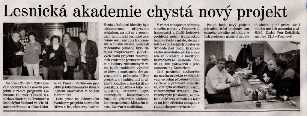 Ve dnech 20.-23.1.2008 započala spolupráce na novém projektu v rámci programu Comenius EU mezi Českou lesnickou akademií v Trutnově a lesnickými školami ve Vic Bigorre ve Francii a oblastí Jamsa ve Finsku. Partnerem projektu je také rumunská škola v Sighetu Marmatiei v oblasti Maramureš.